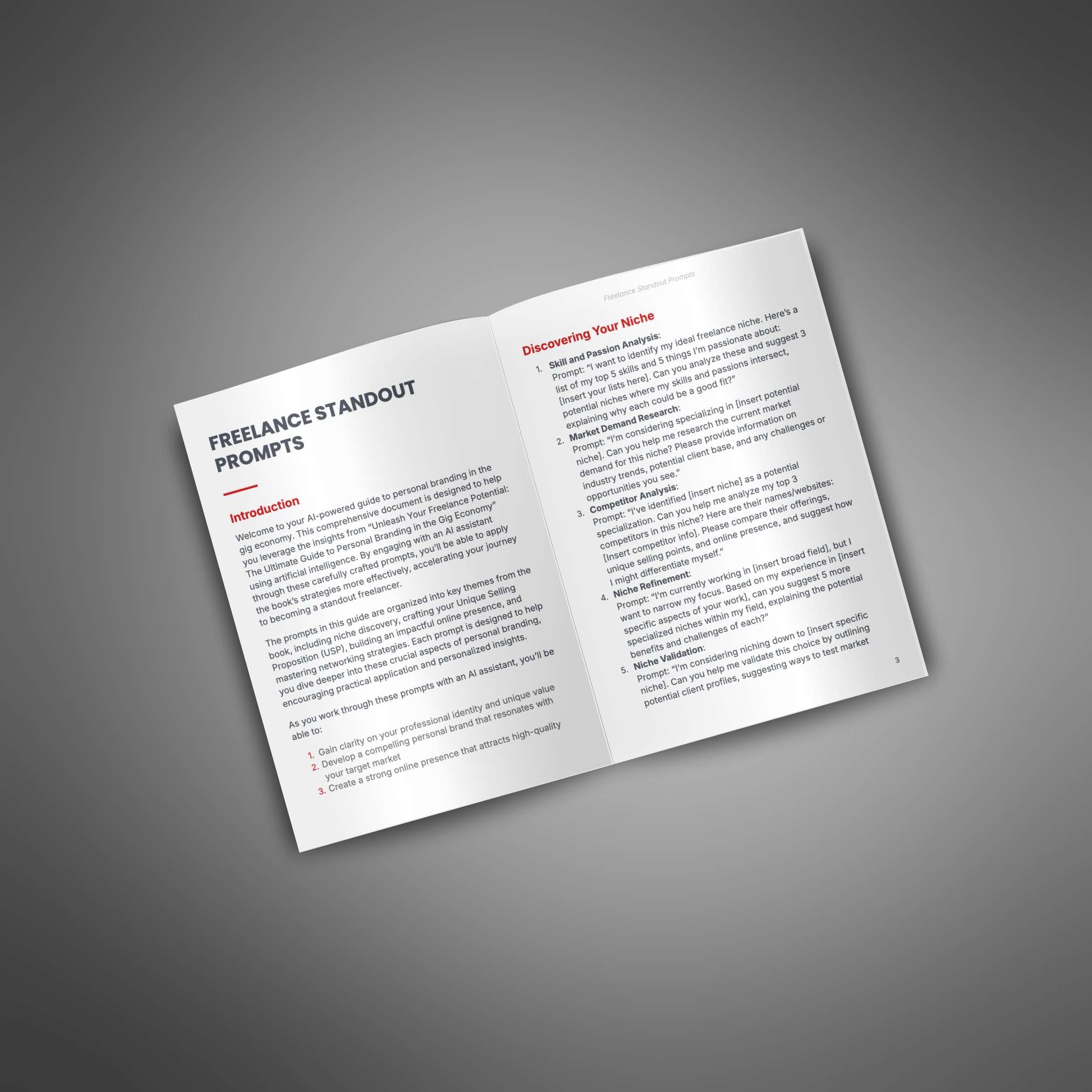 - Prompts for identifying skills and passions to find the ideal freelance niche.